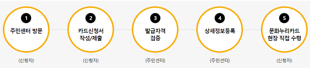 신청자가 주민센터를 방문하여 카드 신청서를 작성하고 제출합니다. 주민센터에서는 발급 자격에 대한 확인 후, 문화누리카드를 현장에서 직접 수령할 수 있도록 발급합니다.