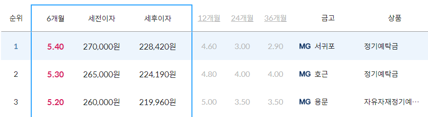 새마을금고를 한번 살펴보겠습니다. 아래 그림을 보면 새마을금고는 시중은행보다 1% 이상 금리가 높은데, 현재는 서귀포와 호근 새마을금고점이 5.3~5.4%로 가장 높습니다. 새마을 금고의 경우는 아래 공식 홈페이지에서 모든 순위를 살펴볼 수 있으며, 특히 우리집 근처 새마을금고 예금금리 가장 높은곳이 궁금할 때도 아래의 지역별 금리순위를 조회해보시면 모두 확인이 가능합니다.